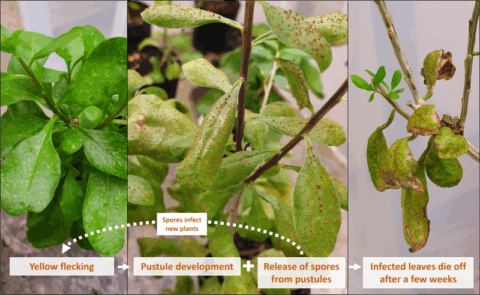 Puccinia rapipes was originally isolated from diseased boxthorn plants in South Africa. Through extensive host-specificity studies undertaken by the CSIRO, the fungus was shown to be highly specific to African boxthorn and cannot damage native Australian vegetation.