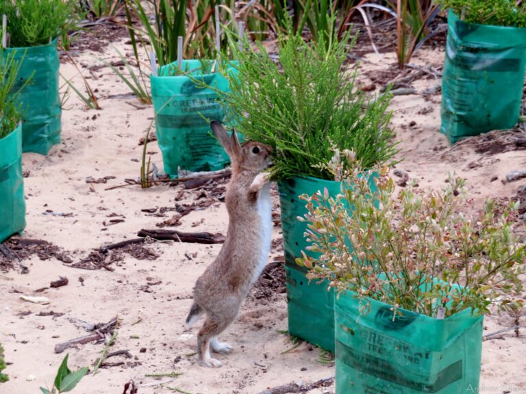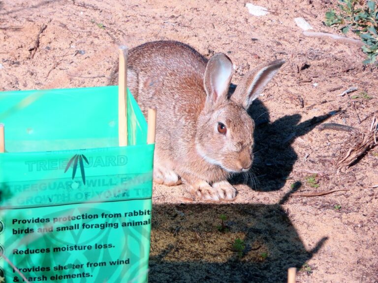 The presence of rabbits means that most seedlings are planted with tree guards, even those species that would not otherwise need them. This adds considerable time and cost to the planting effort. Some species that are particularly palatable to rabbits have been protected with “quokka” style (EcoTek Polymesh) guards that are left in place for years.