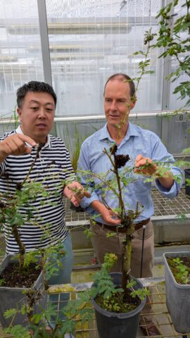 Caption: From left: Dr Boyang Shi of QDPI and Dr John Virtue of CISS examine how prickly acacia is damaged by the gall thrip biocontrol agent as the project gets underway. Image: Jason Callander.